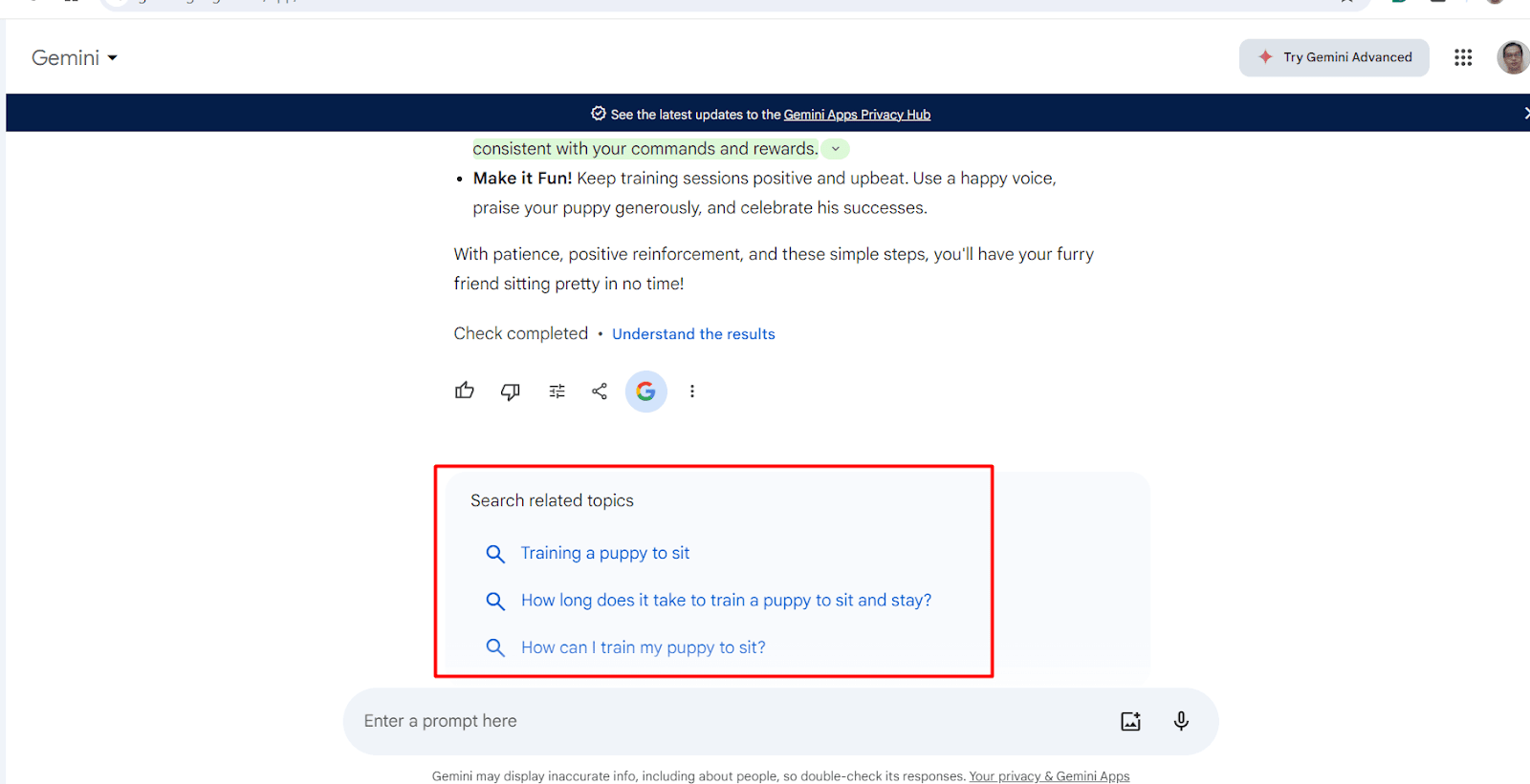 Another cool feature of Gemini is the “related topics section.” At the bottom of the article, it will tell you what people are searching for—these are keywords related to the topic you asked Gemini to write about.