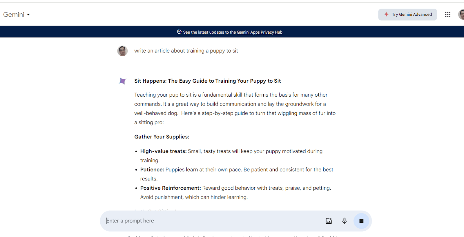 Google Gemini is easy to use. All you need to do is write prompts, or commands, to tell the AI what to do.