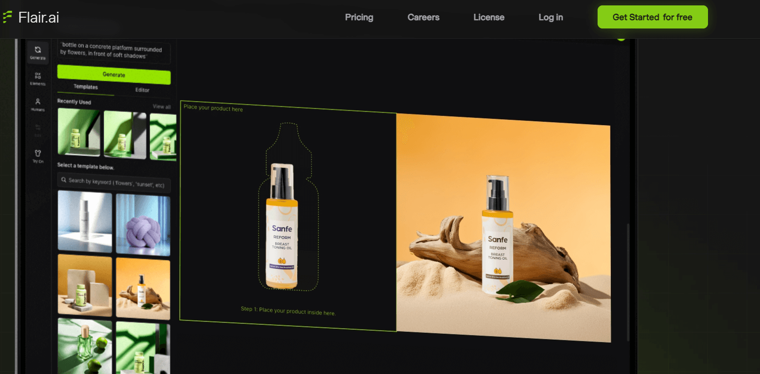 As you can see, you only need to upload a product photo, and then you can generate a new background. With Flair, you can also: