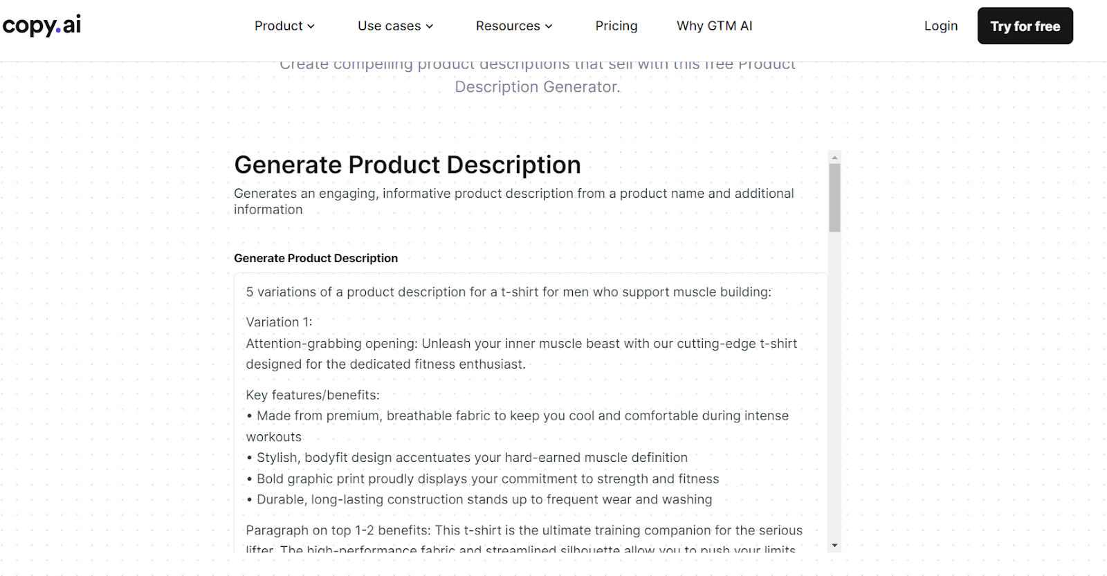 I just prompted this machine and said that my product is a t-shirt for men who are into bodybuilding. CopyAI produced five variations of the copy.
