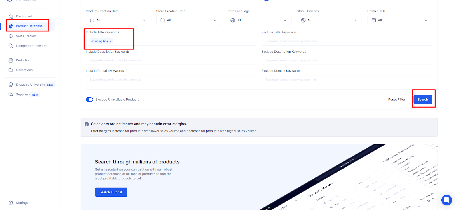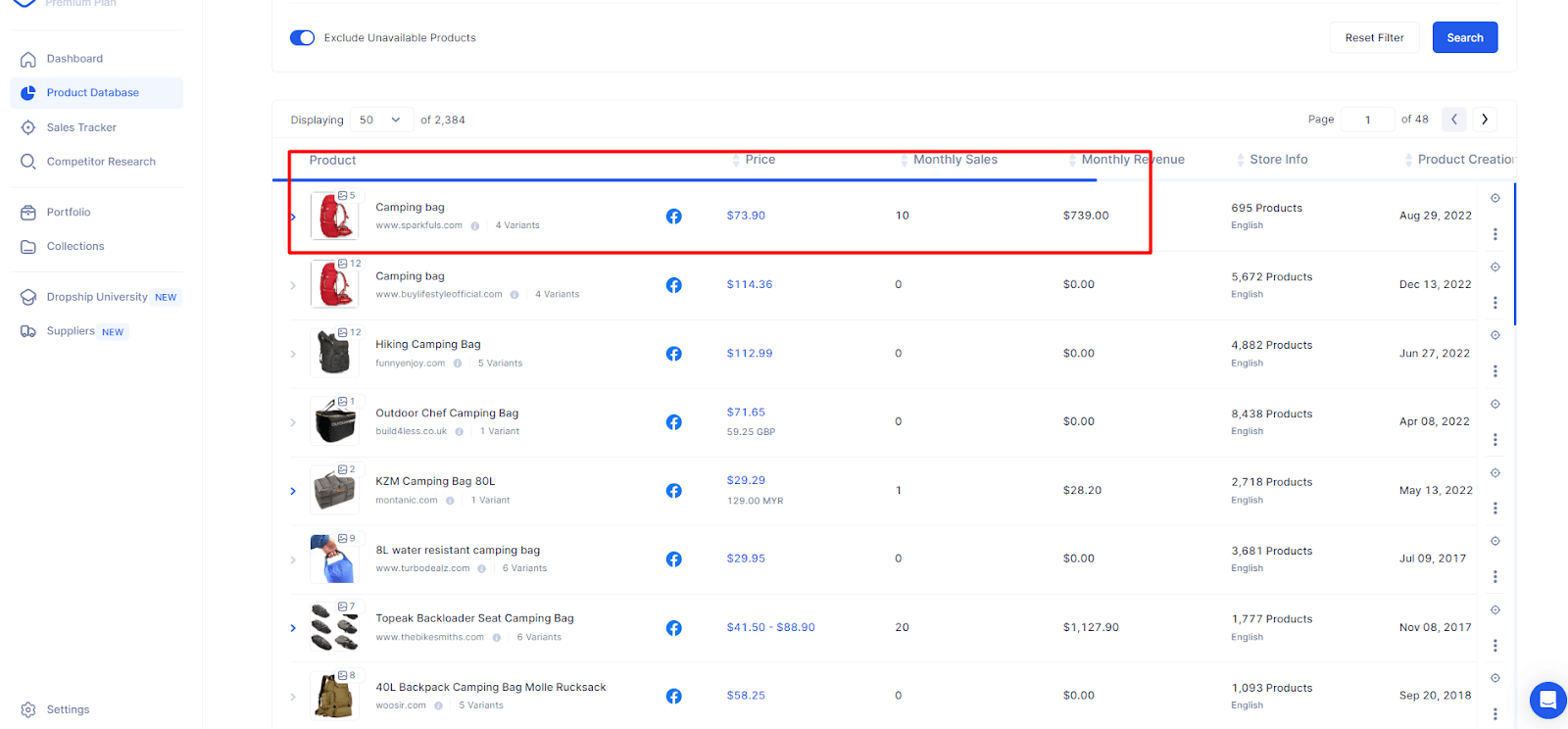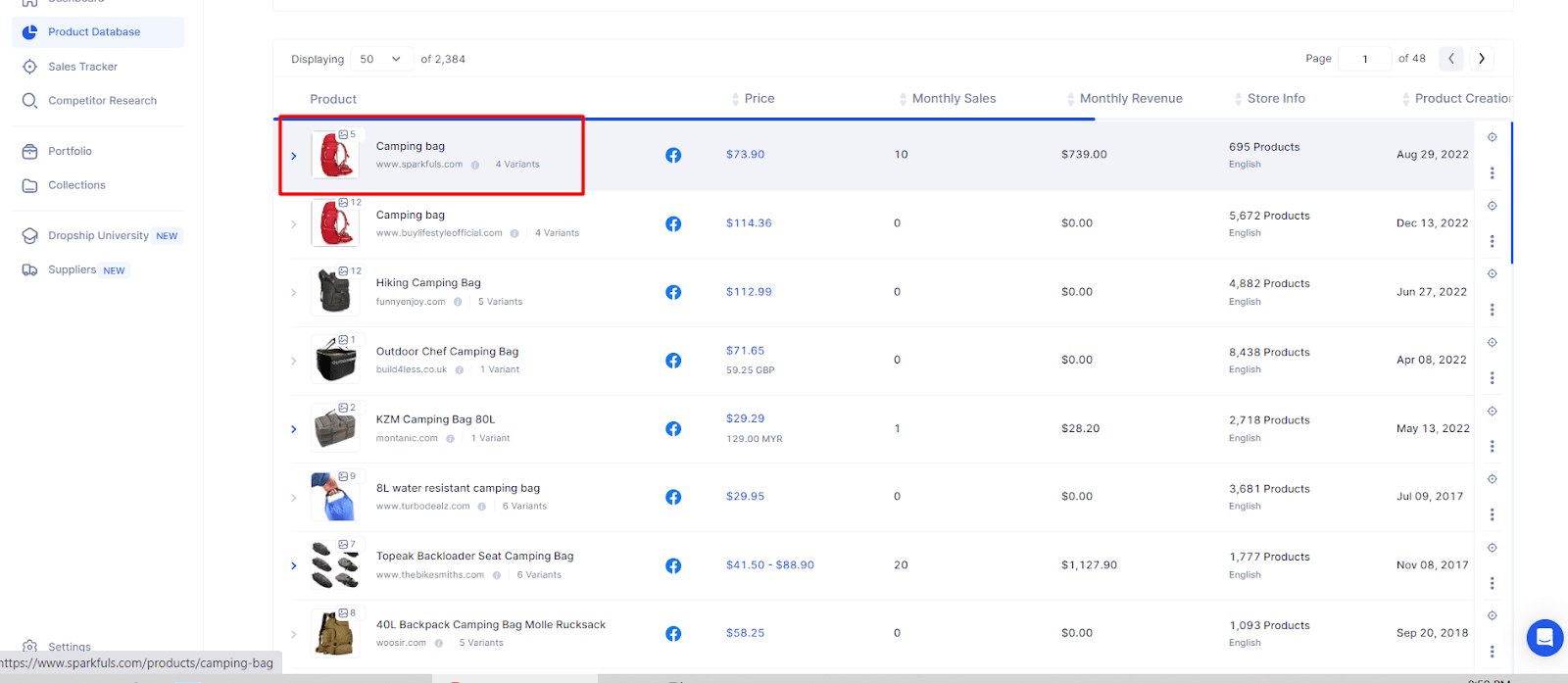 The first step to finding a winning product is through our database. I typed “camping bag” in the screenshot below and pressed the “search” button.