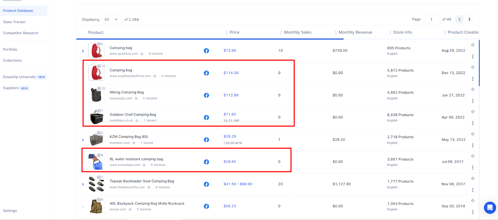 After the system loaded the search results, the screenshot below appears. We can see the different camping bags, prices, and monthly sales.
