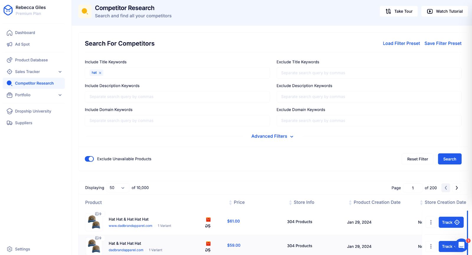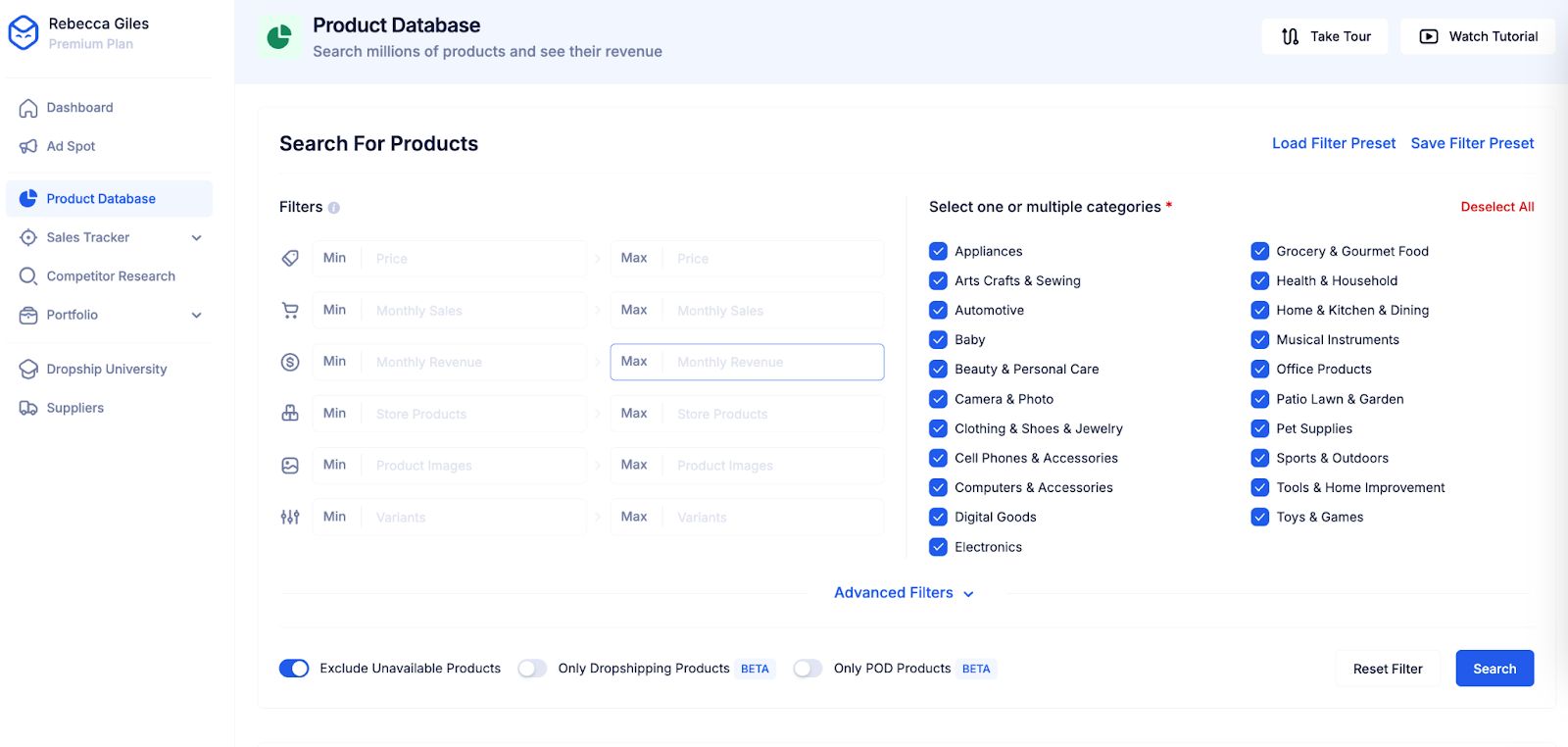- Product Database - Use the advanced filters to find specific products that fit your winning criteria. For example, you can search for products that make a certain number of sales per month, the product's price, the product categories, and more. The results that Dropship shows are products sold by real Shopify sellers. This allows you to find products with proven results.