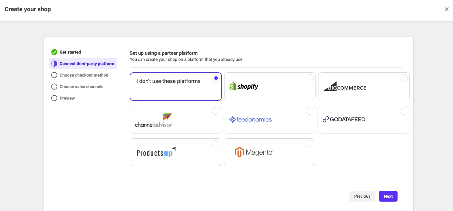 If you click, ‘I don’t use these platforms,’ you can continue creating your Instagram shop here.