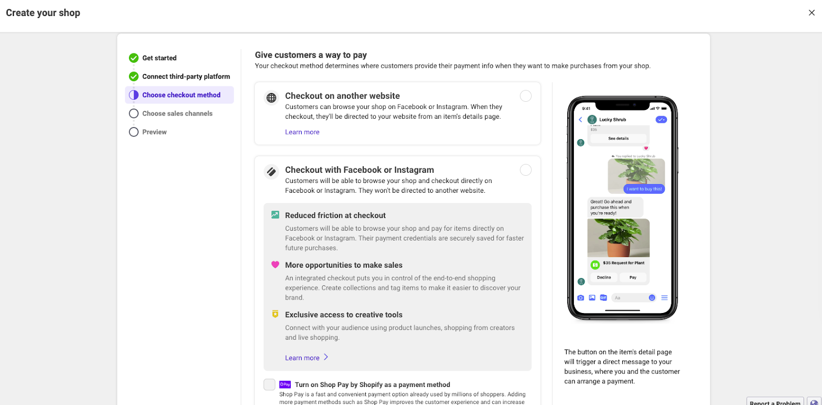 You might also see a Checkout with Messaging option. This option is only available for Facebook shops.