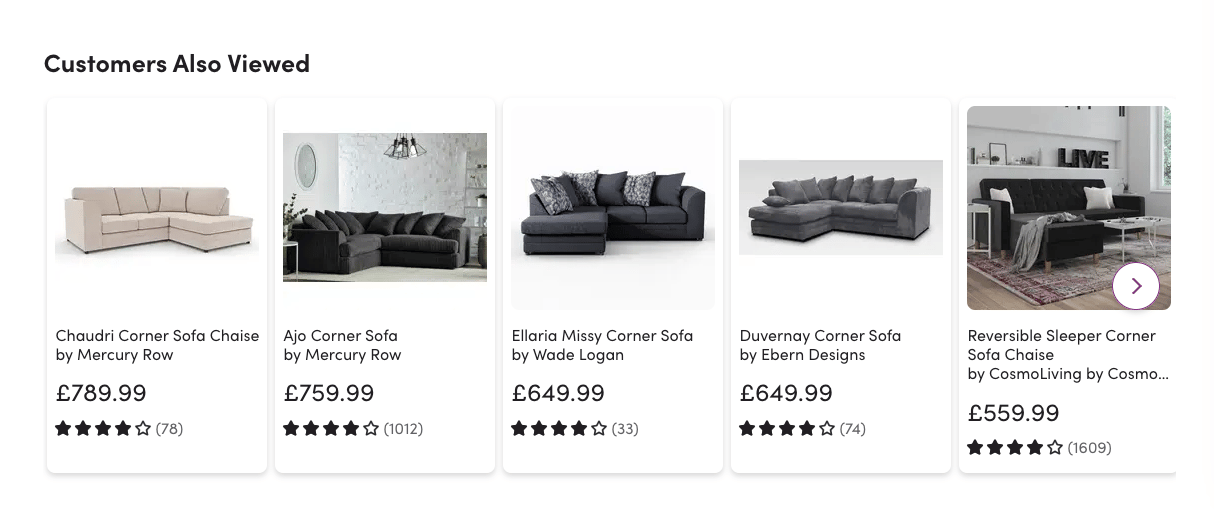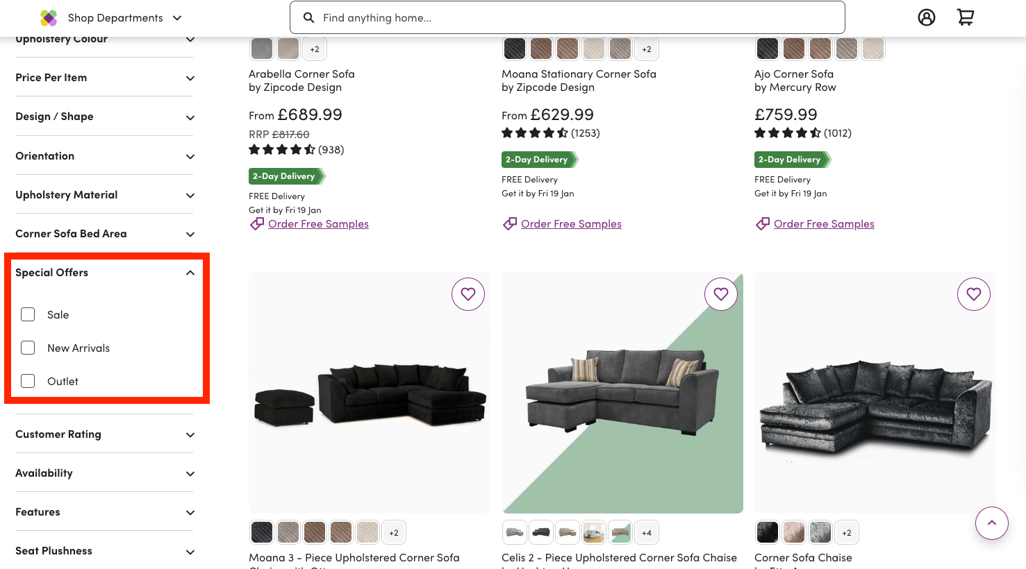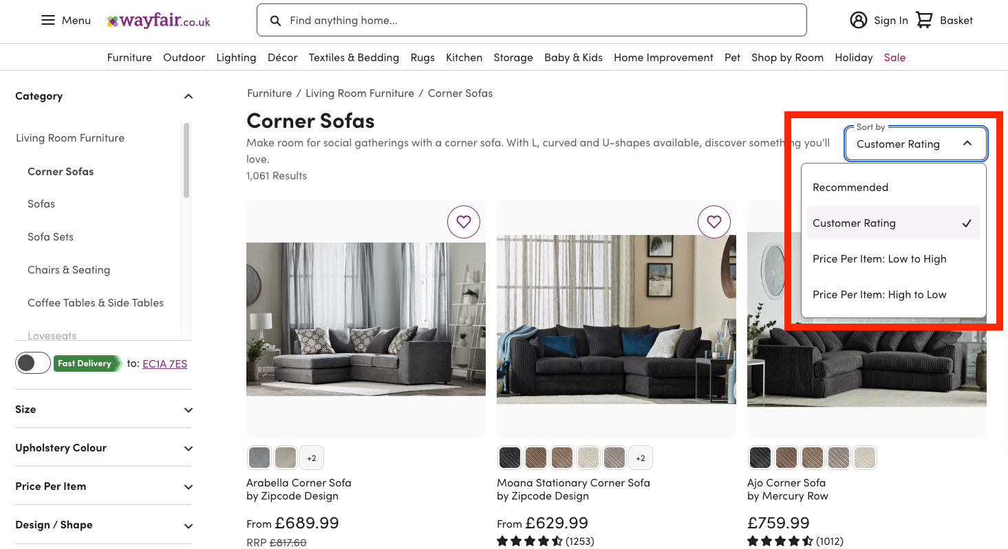 As well as sorting by customer reviews, you can also use the filters on the left-hand side. Wayfair has a comprehensive menu to help shoppers find what they’re looking for.