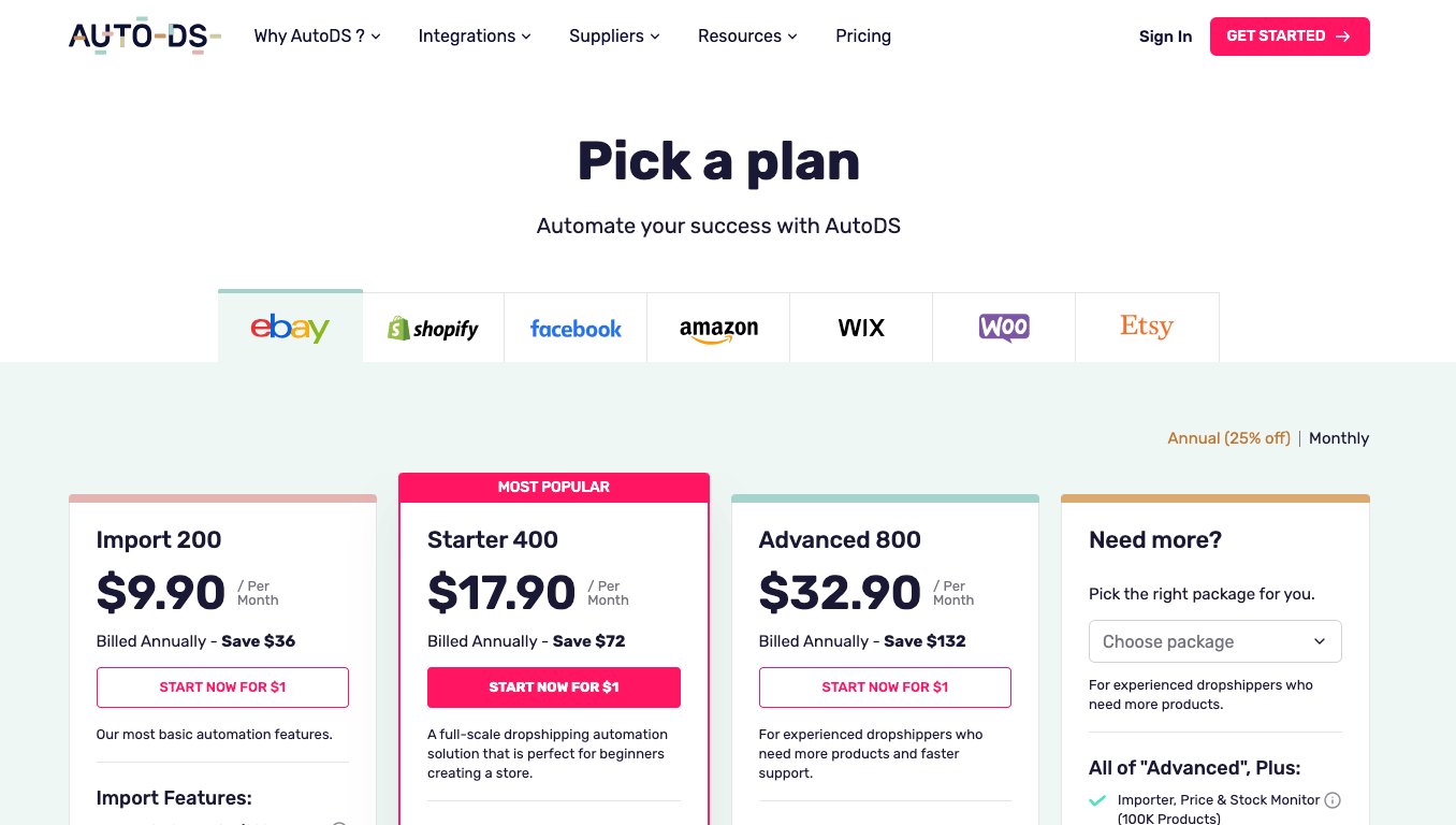 AutoDS works with eBay, Shopify, Facebook, Amazon, Wix, WooCommerce, and Etsy.