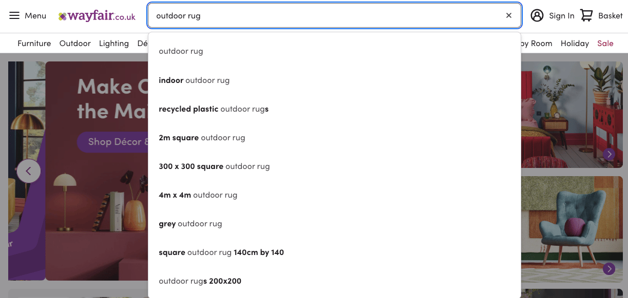 Start typing the name of a product into the Wayfair search bar, and it will suggest products.