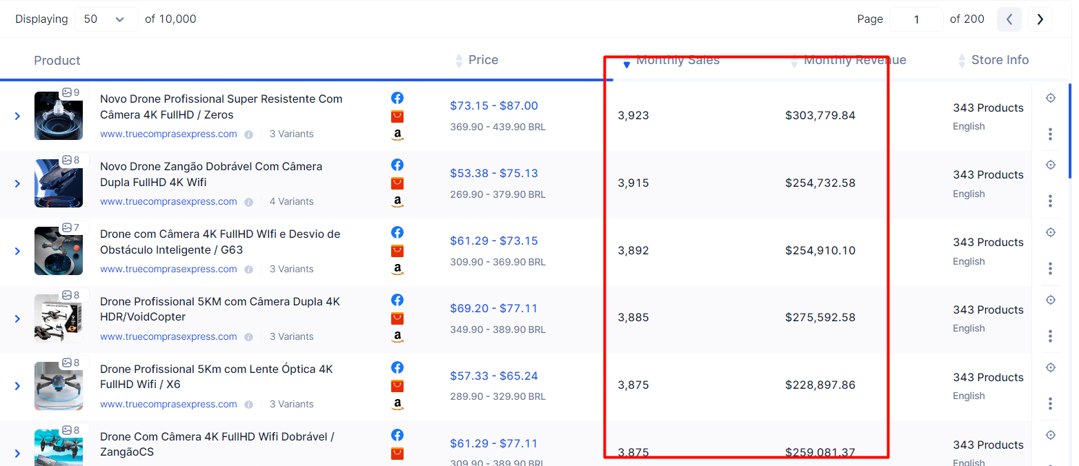 Dieser Screenshot zeigt das Ergebnis einer Suche in unserer Datenbank nach Drohnen. Wie Sie sehen, zeigt die Grafik die Bilder und Quellen der Produkte. Außerdem können Sie auch die monatlichen Verkäufe und den Umsatz jedes Artikels einsehen.