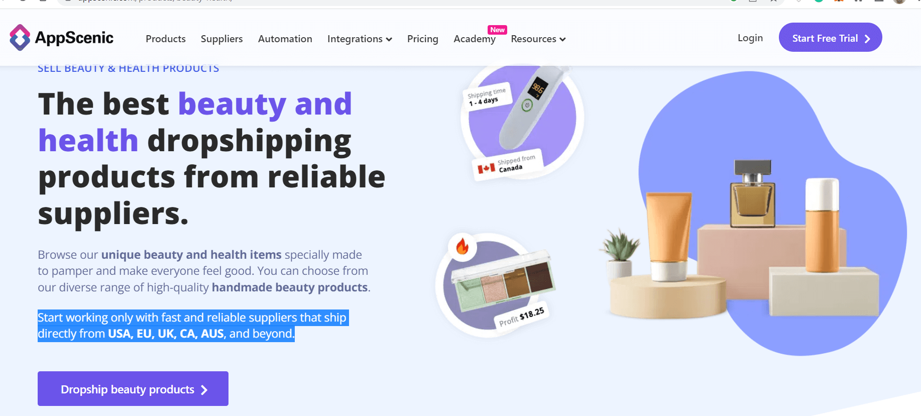 AppScenic ist eines der größten Dropshipping-Lieferantentools weltweit. Ich empfehle dieses System, weil sie Lagerhäuser und Lieferanten in den USA, im Vereinigten Königreich, in Kanada, und der EU haben. Dadurch kannst du gezielt Parfüm-Märkte für Dropshipping ansprechen, ohne dir Gedanken über den Versand machen zu müssen.