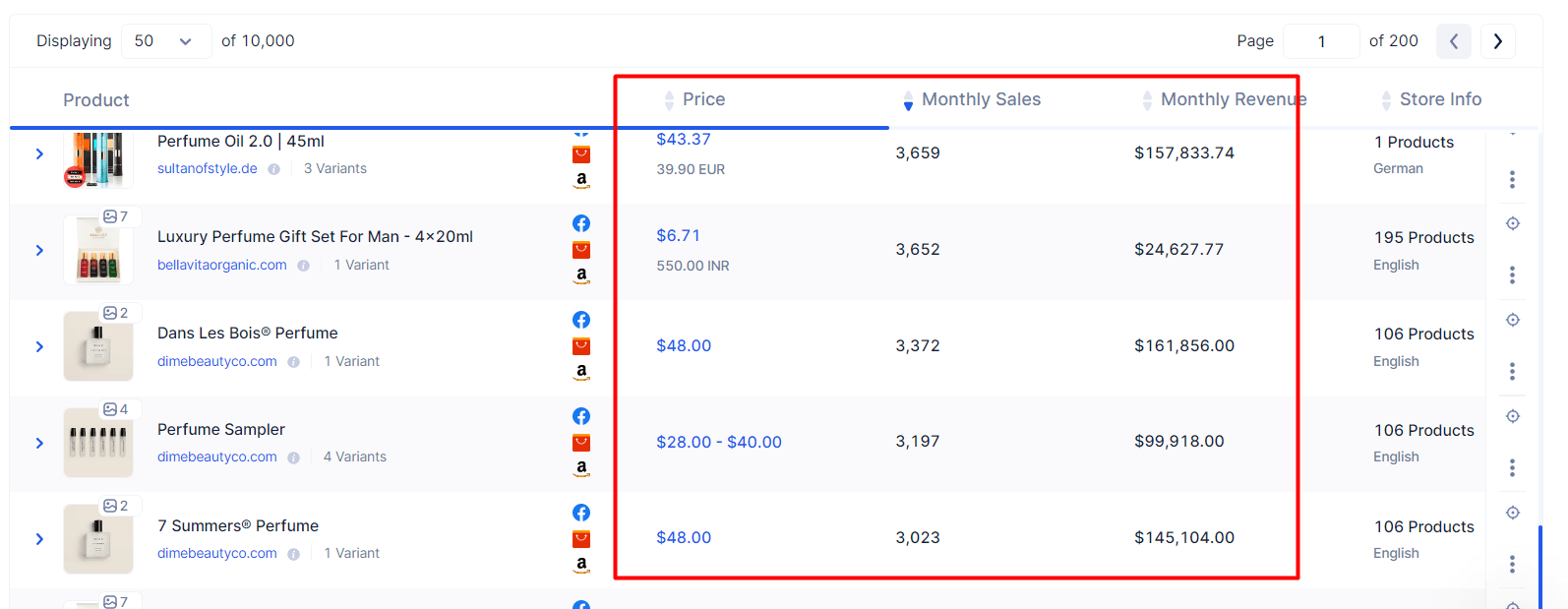 Sobald das System eine Suche zurückgibt, können Sie sich das jeweilige Produkt von Interesse ansehen, den Preis, die monatlichen Verkaufszahlen und den monatlichen Umsatz.