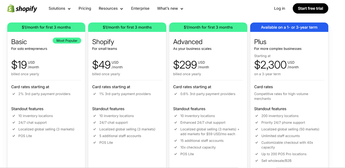 Ein typischer Dropshipping-Shop kostet Sie mindestens 19 $ pro Monat an Webhosting-Gebühren. Unten sehen Sie die aktuellen Preise für ein Shopify-Abo.
