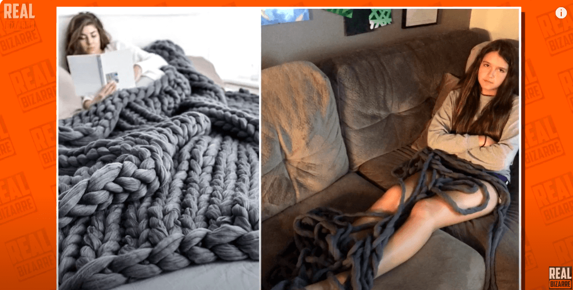 Wie Sie sehen, sollte das Produkt eine Decke sein, aber die Person, die es gekauft hat, erhielt riesige Fäden, keine Decke. Dasselbe passiert immer wieder bei Spielzeugen, Leinwandpostern, aufblasbaren Schwimmbecken usw.