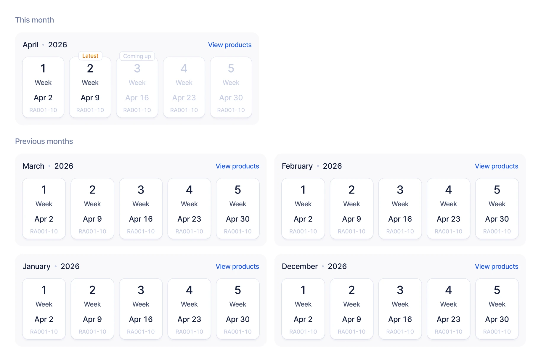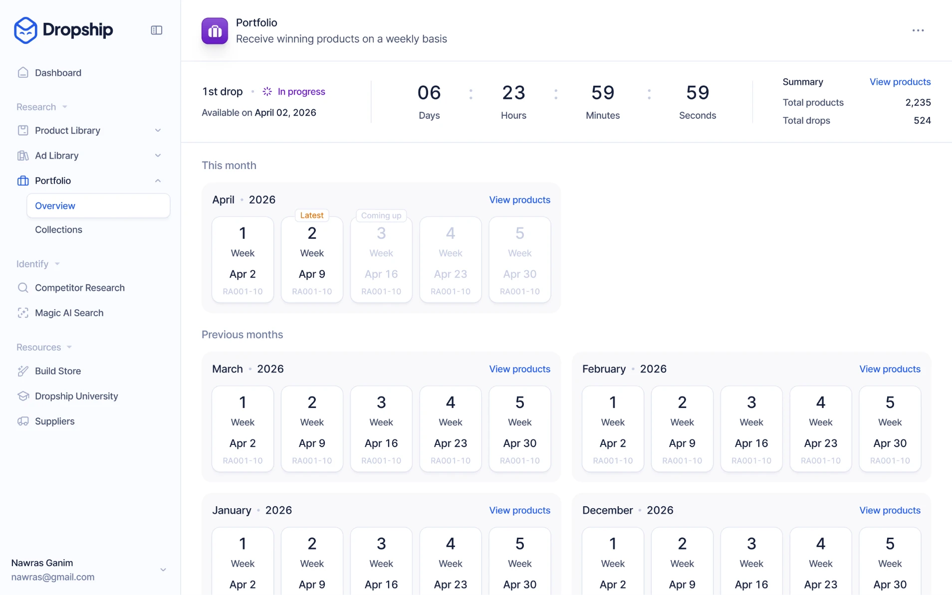 Jede Woche am Montag um 12 Uhr EST wird ein Drop mit bis zu 40 Produkten in Ihr Portfolio aufgenommen.