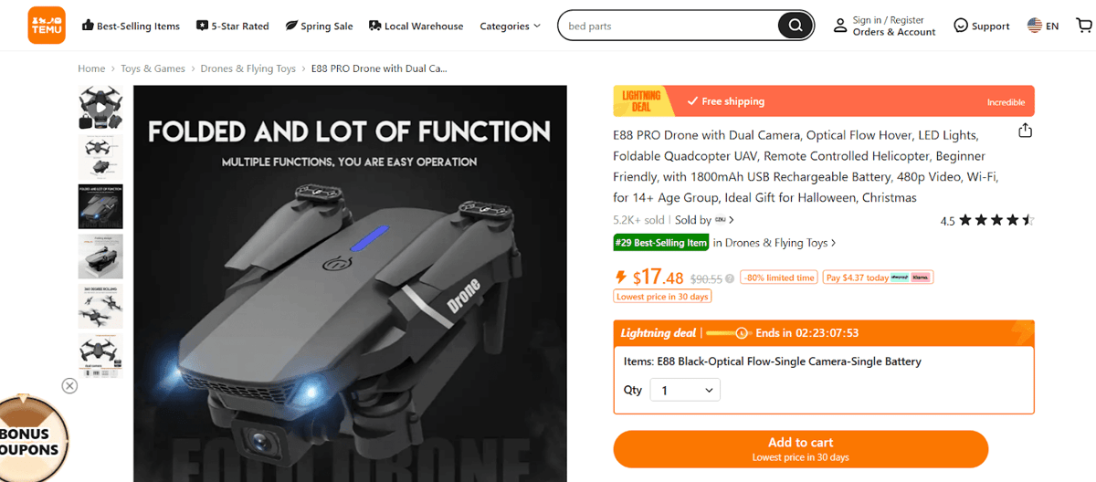 Temu regorge de répliques, principalement de mauvaise qualité. C'est pourquoi les produits sont si bon marché. Voici une capture d'écran d'un drone de marque original :