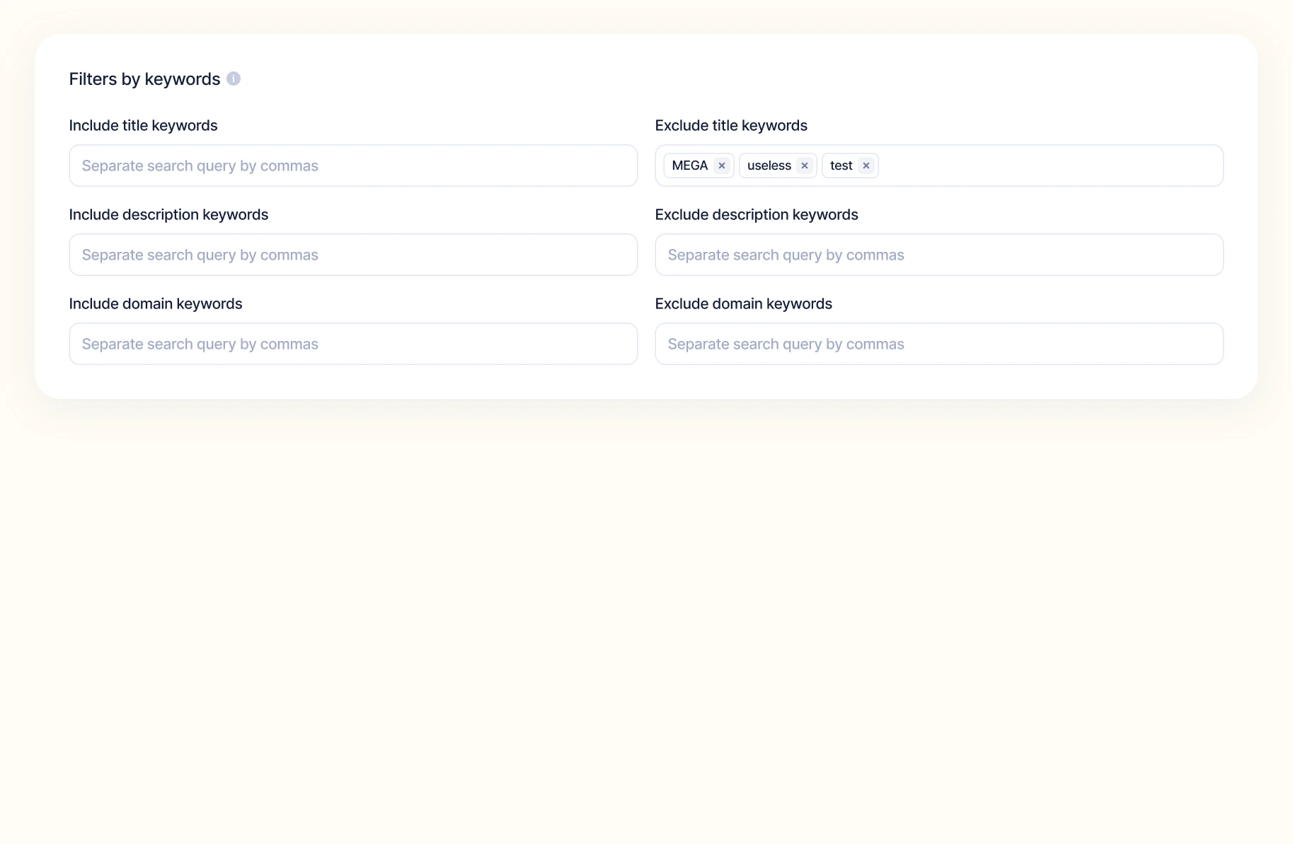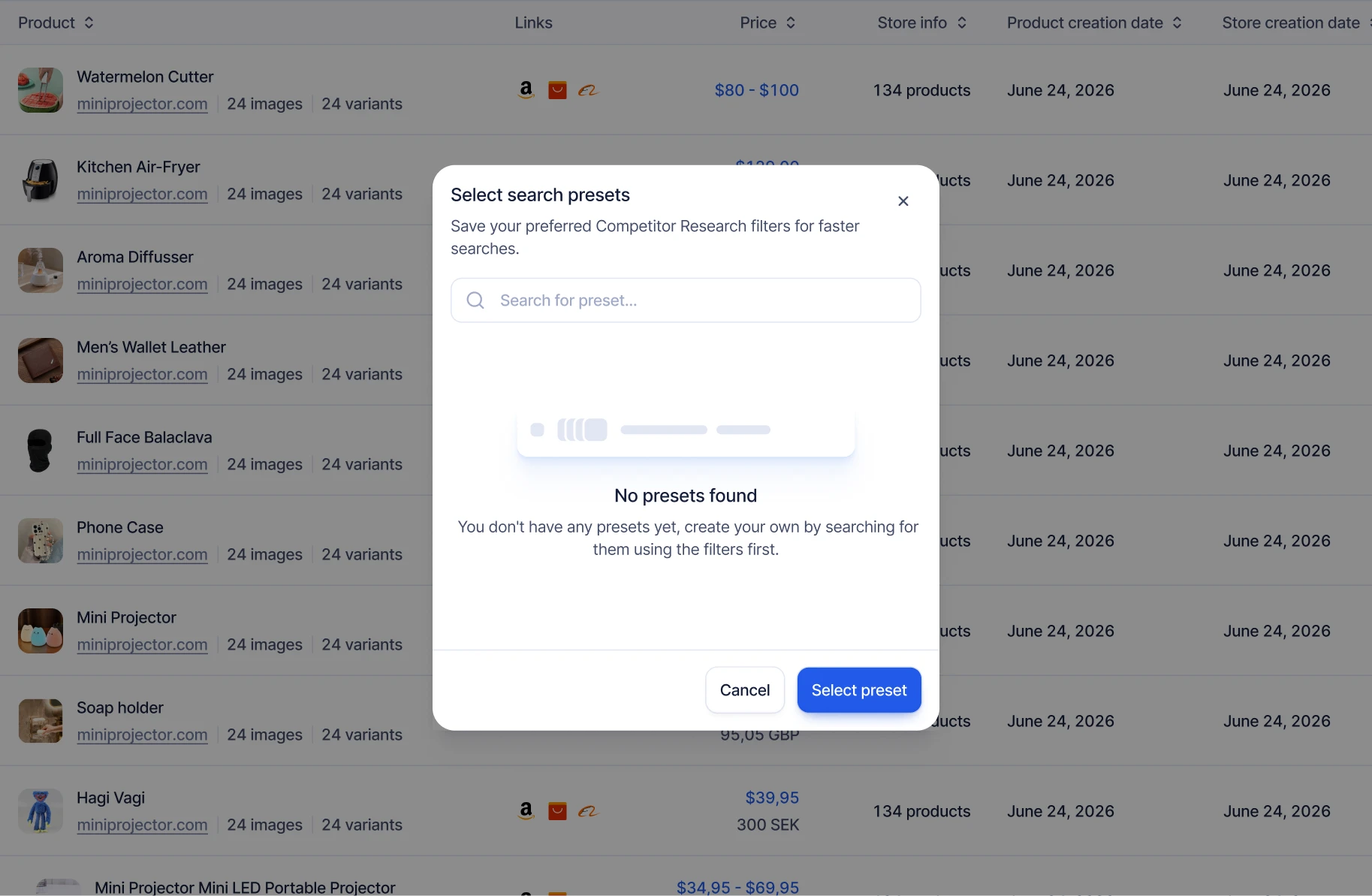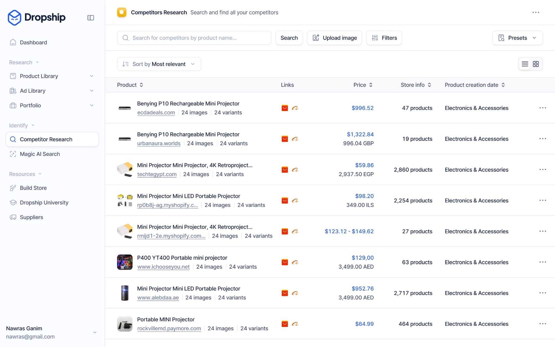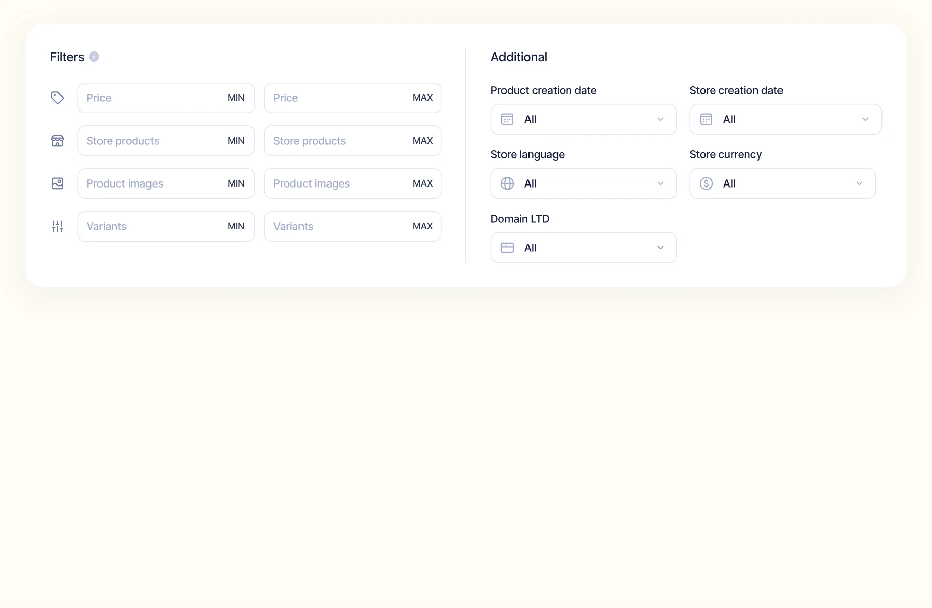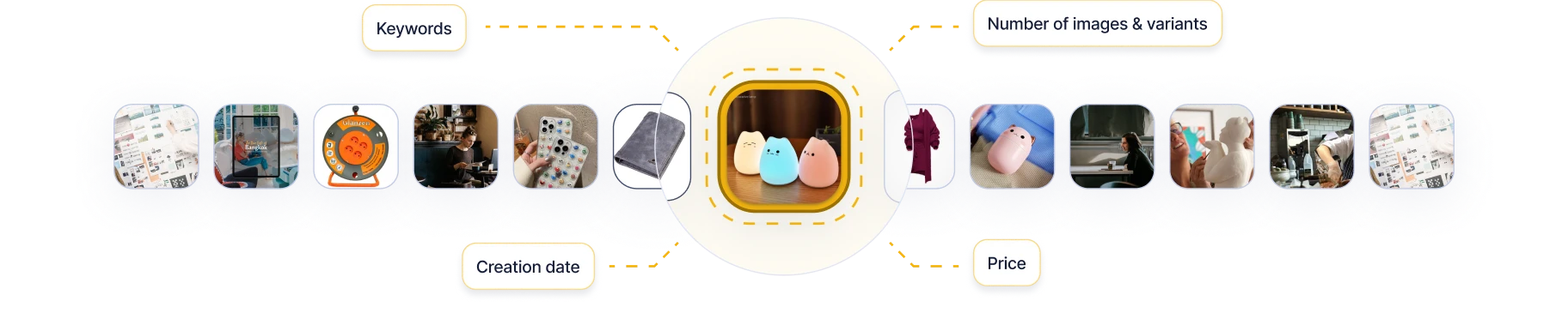 Trouvez les produits de vos concurrents en fonction de leur prix, de leur date de création, du nombre d'images, du nombre de variantes, de mots clés et bien plus encore.