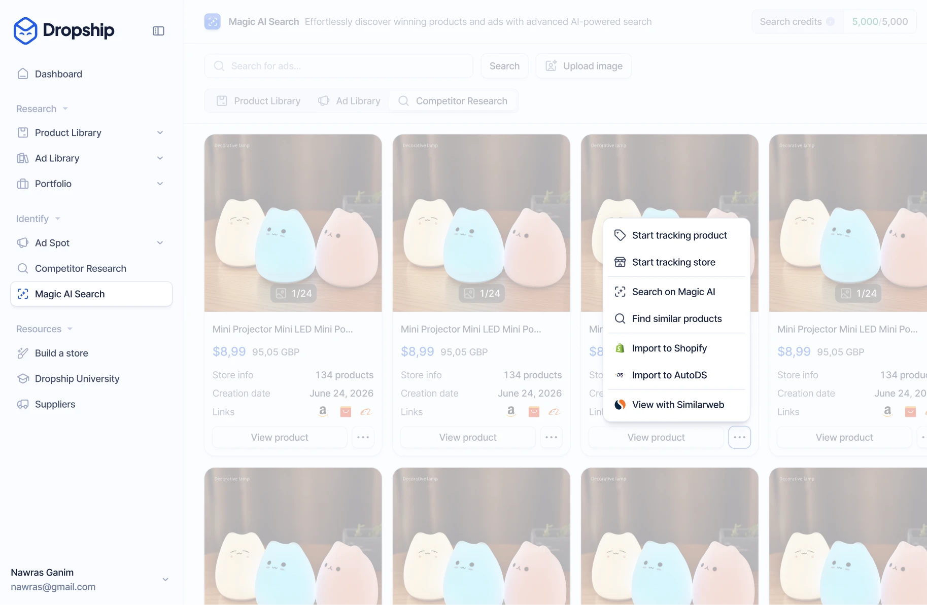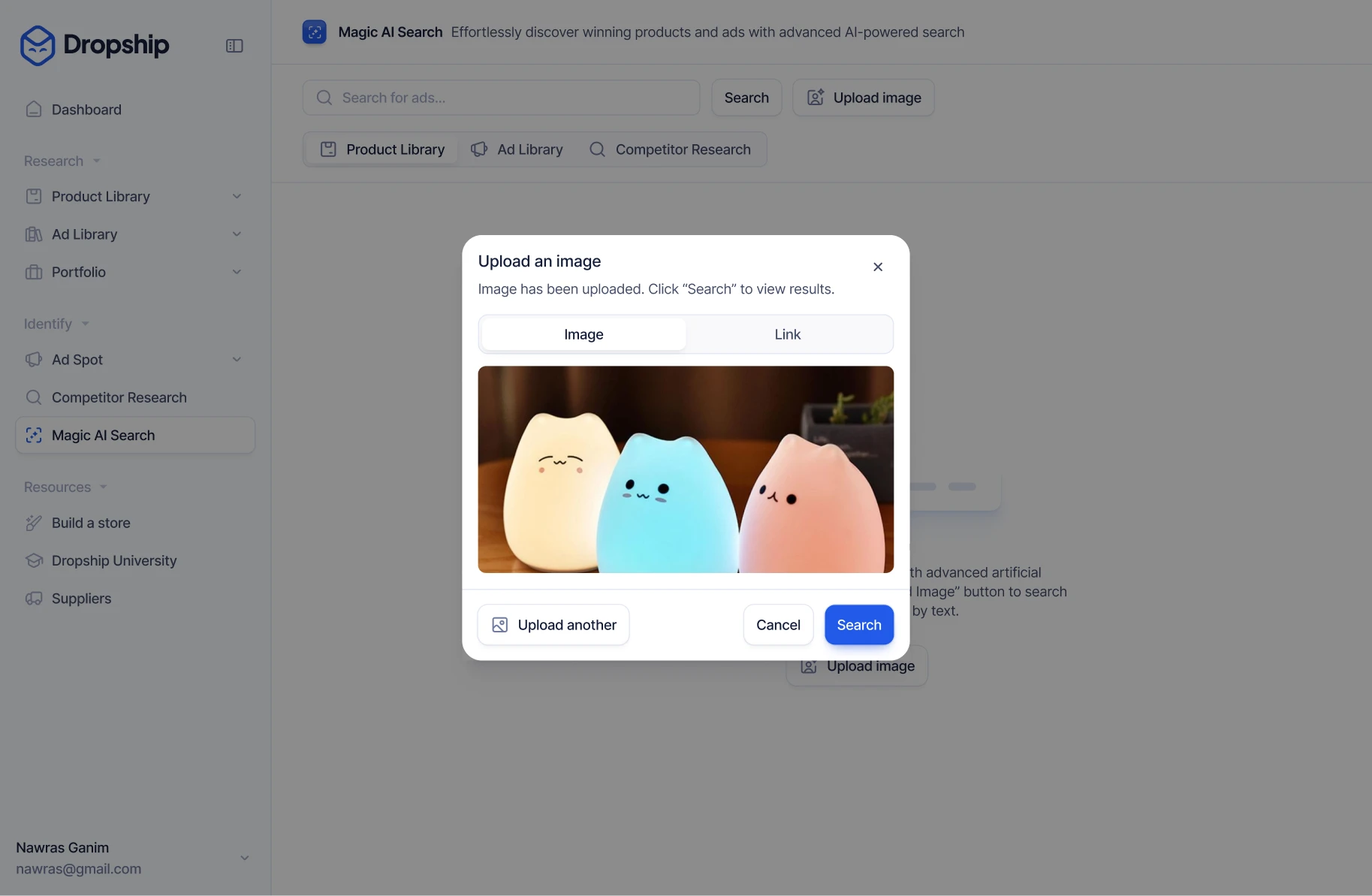 Upload elke afbeelding, video of link en Magic AI Search vindt passende producten en advertenties in de volledige database van Dropship.