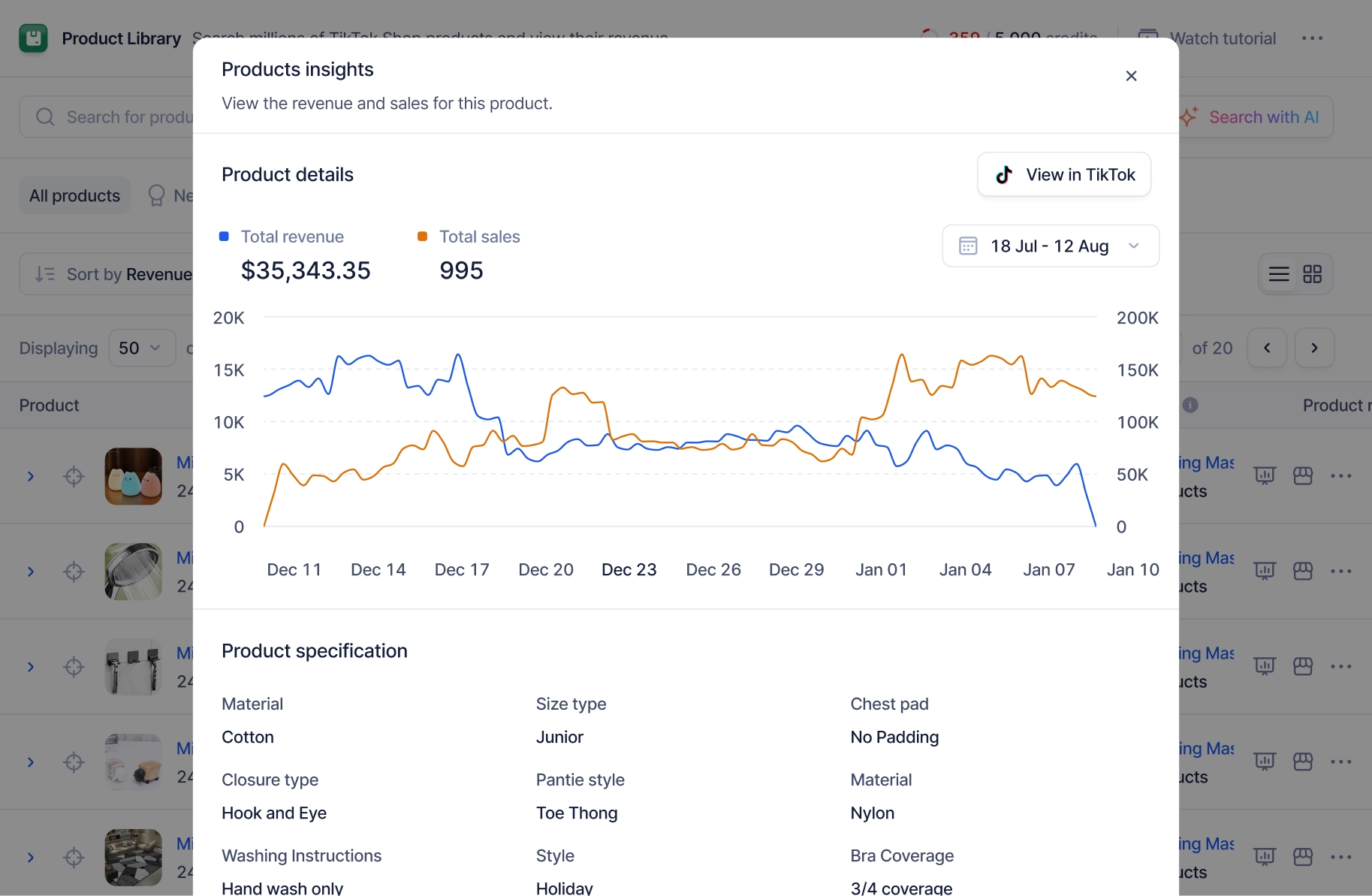 Find out about the numbers behind any TikTok Shop product. Monitor daily sales, spot trending products, and make informed decisions using our Product Library.