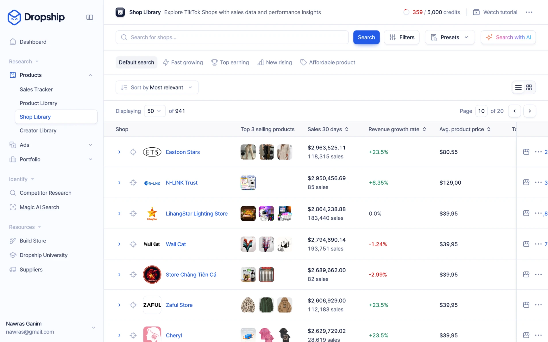 Shop Library ranks TikTok Shops by estimated daily revenue, so you see the market leaders and the risers at the same time.