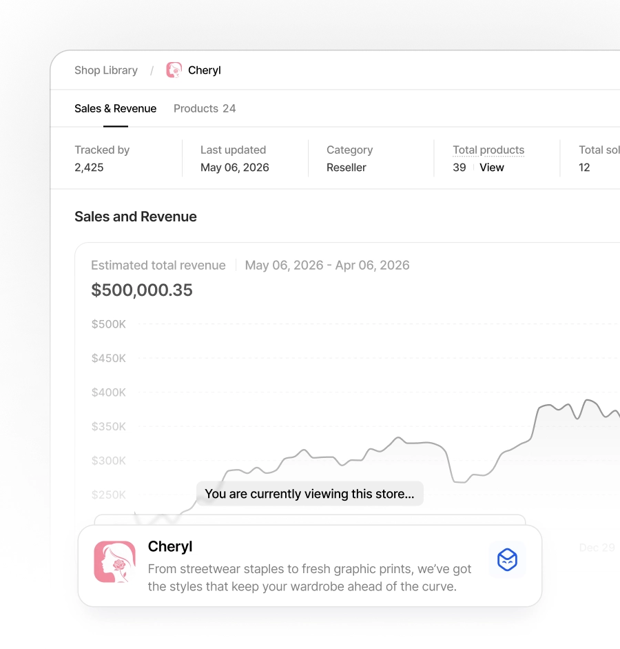 Dig into any shop with full revenue charts, product counts, and sales history at your fingertips.