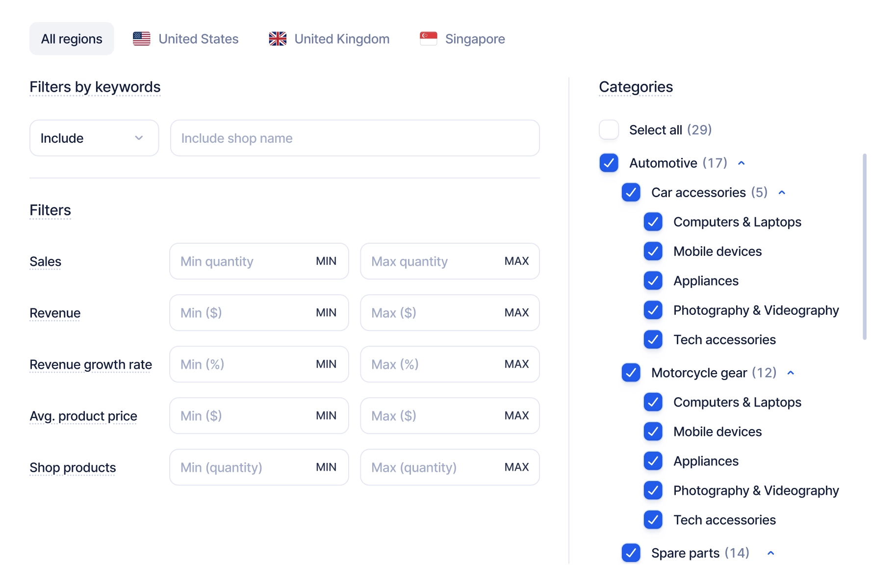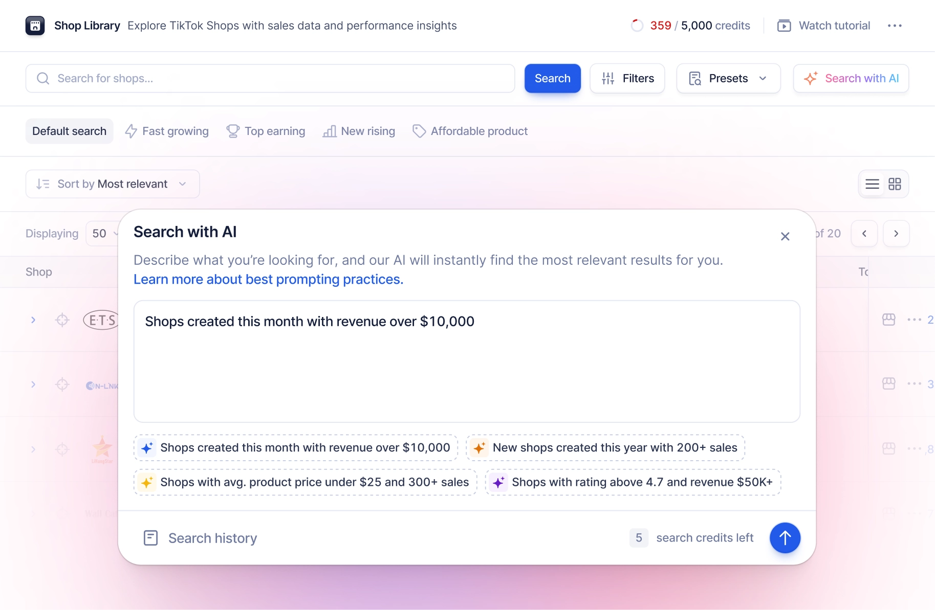 Every TikTok Shop in the library comes with a full store overview, quick-access presets, and the filters to narrow millions of shops down to the ones you want to study.